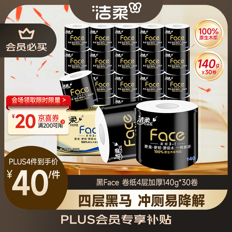 洁柔有芯卷纸 黑Face4层140克*30卷 厚韧耐用 卫生纸卷筒纸纸巾整箱
