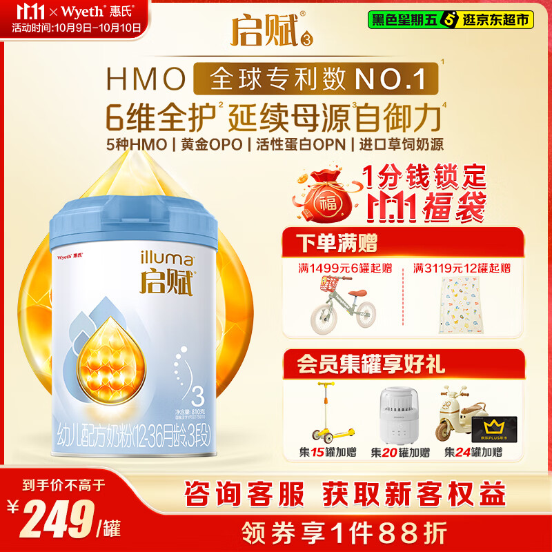 惠氏(Wyeth)启赋蓝钻HMO幼儿配方奶粉3段(12-36月)810g