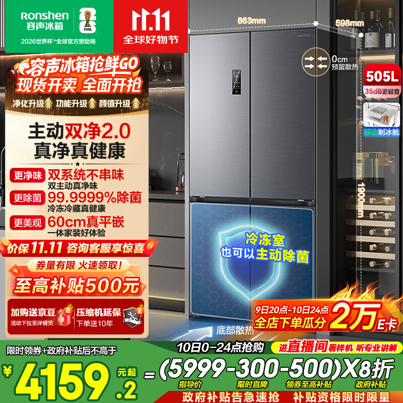 容声方糖505主动双净双系统十字四开门超薄零嵌入式电冰箱家用制冰一级能效BCD-505P60CZMAD灰国家补贴