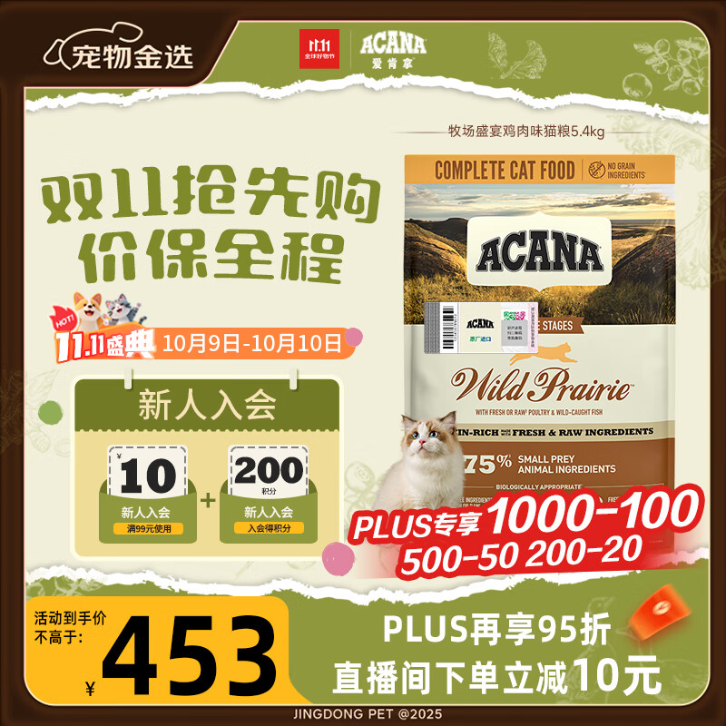 愛肯拿(ACANA)猫粮 牧场盛宴成猫幼猫粮 高蛋白无谷进口鸡肉粮5.4kg 效期26/6