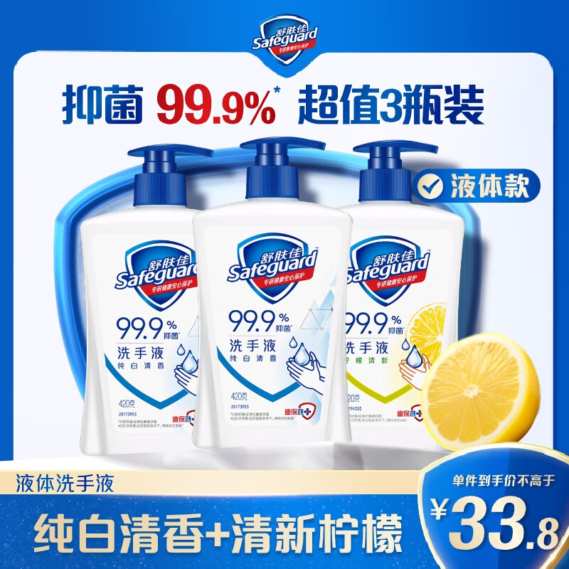 舒肤佳抑菌洗手液 420g*3瓶(纯白*2+柠檬)健康抑菌99.9%新旧包装随机