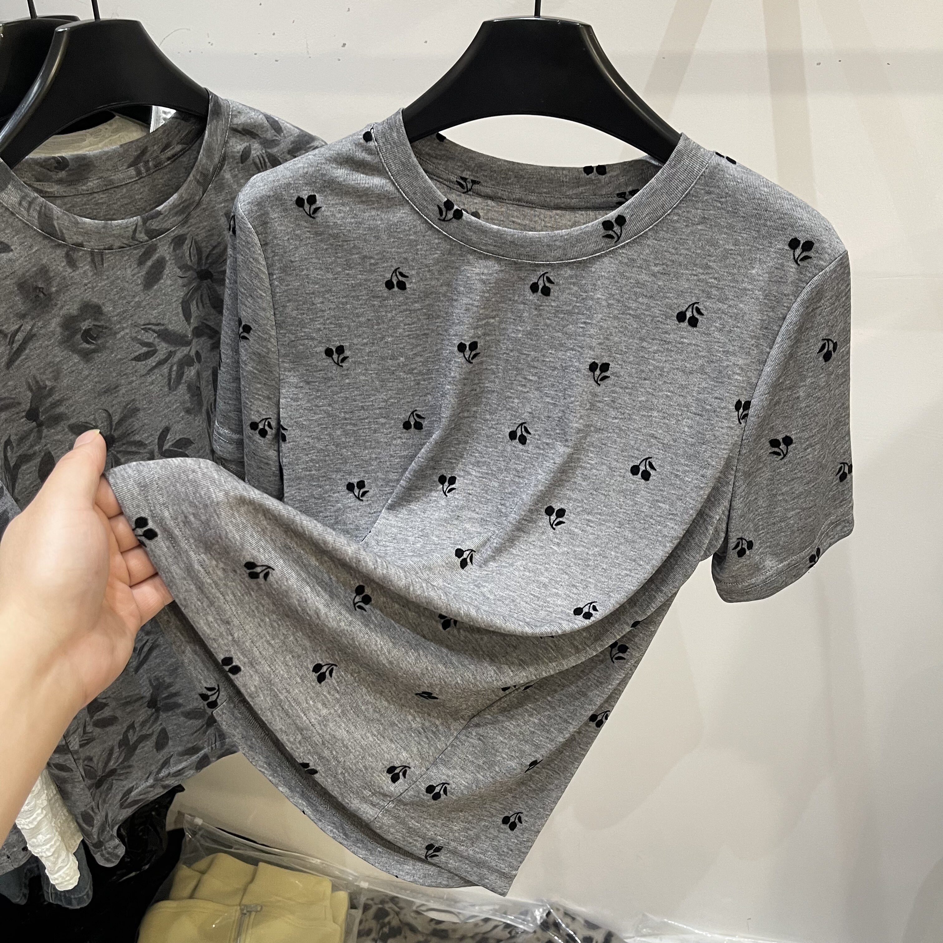 植绒樱桃印花短袖T恤女2026夏季新款灰色圆领休闲减龄百搭上衣潮