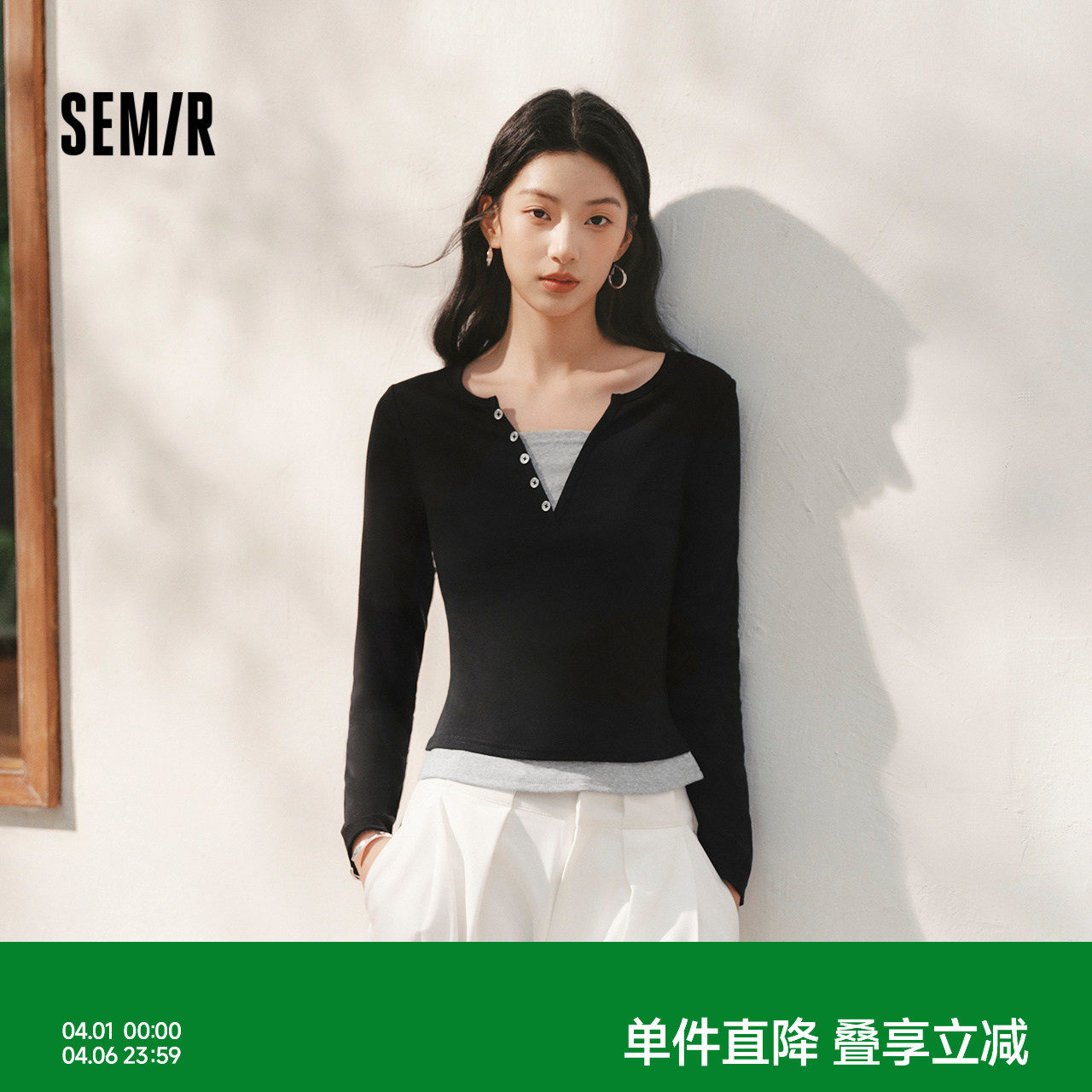 森马长袖T恤女春季短款紧身假两件2026新款设计感显瘦气质套头衫