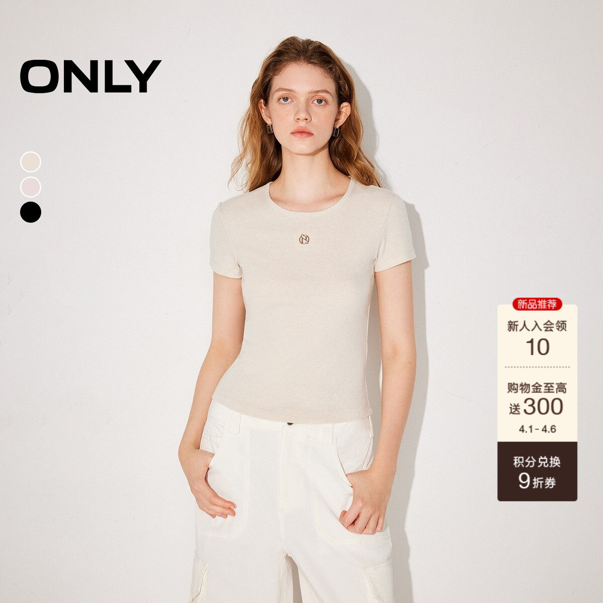 ONLY2026春季新款U型领口弹力百搭基础款刺绣正肩短袖上衣T恤女