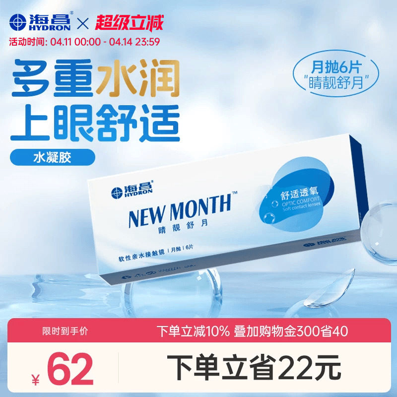 海昌睛靓舒月月抛6片隐形近视眼镜高清水润舒适透明镜片官方正品