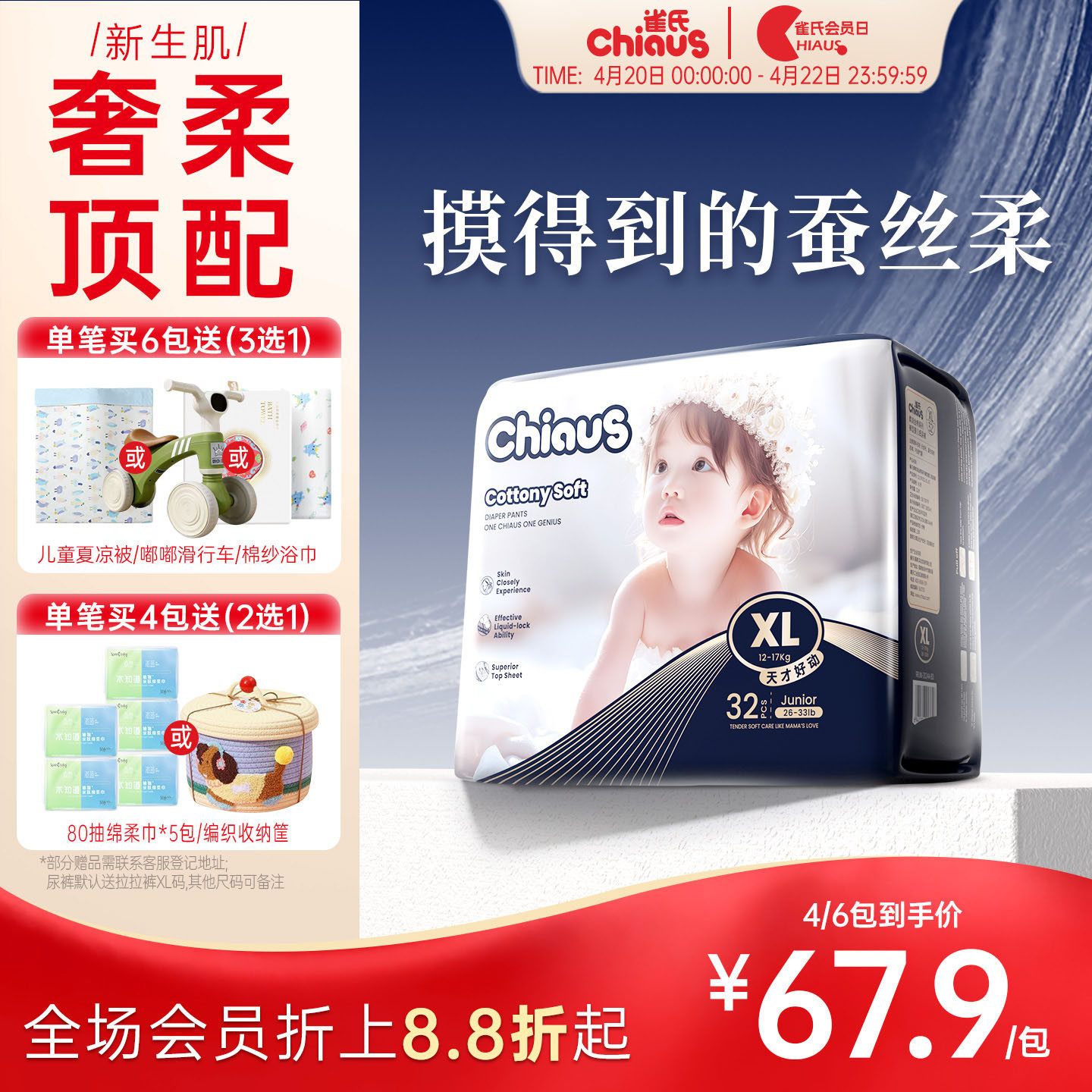 【新生奢柔】雀氏出口铂金柔润金棉婴儿纸尿裤NB-6XL敏感肌专用