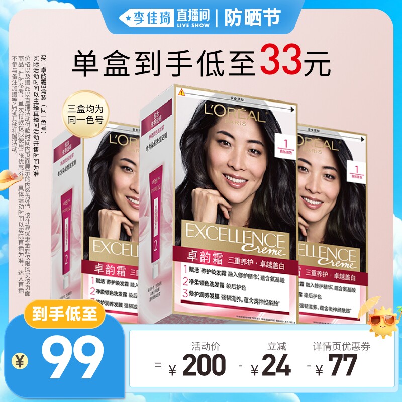 【李佳琦直播间防晒节】欧莱雅卓韵霜染发膏自然黑色遮盖白发*