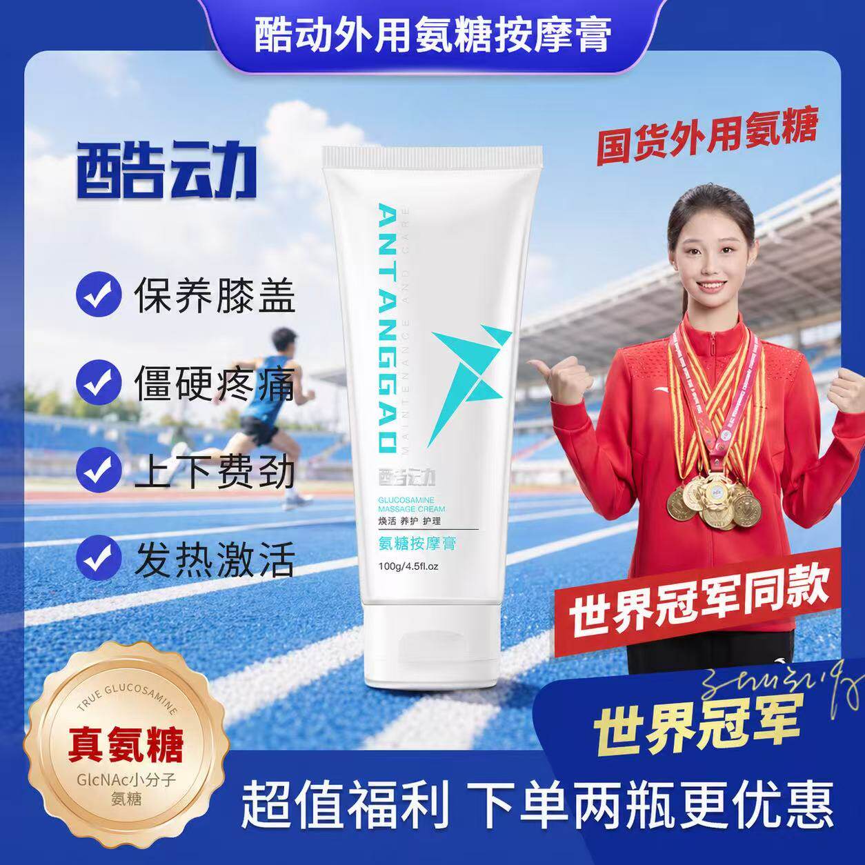 世界冠军代言酷动氨糖小白管 运动人群膝盖关节保养 避免受伤