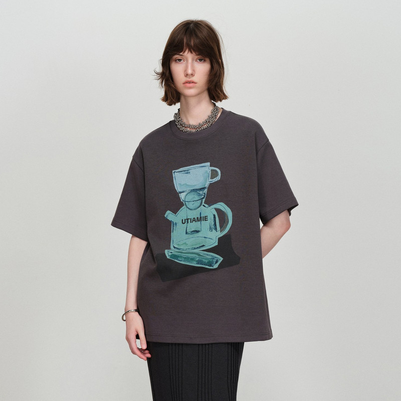 uti2026春季新款 深灰色休闲宽松短袖T恤女落肩上衣UL140108983