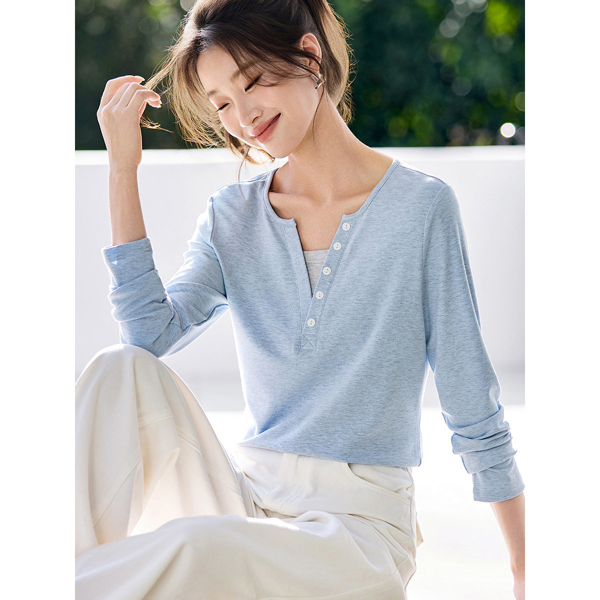 沫晗依美休闲百搭撞色拼接假两件T恤2026夏新款清凉透气显瘦长袖