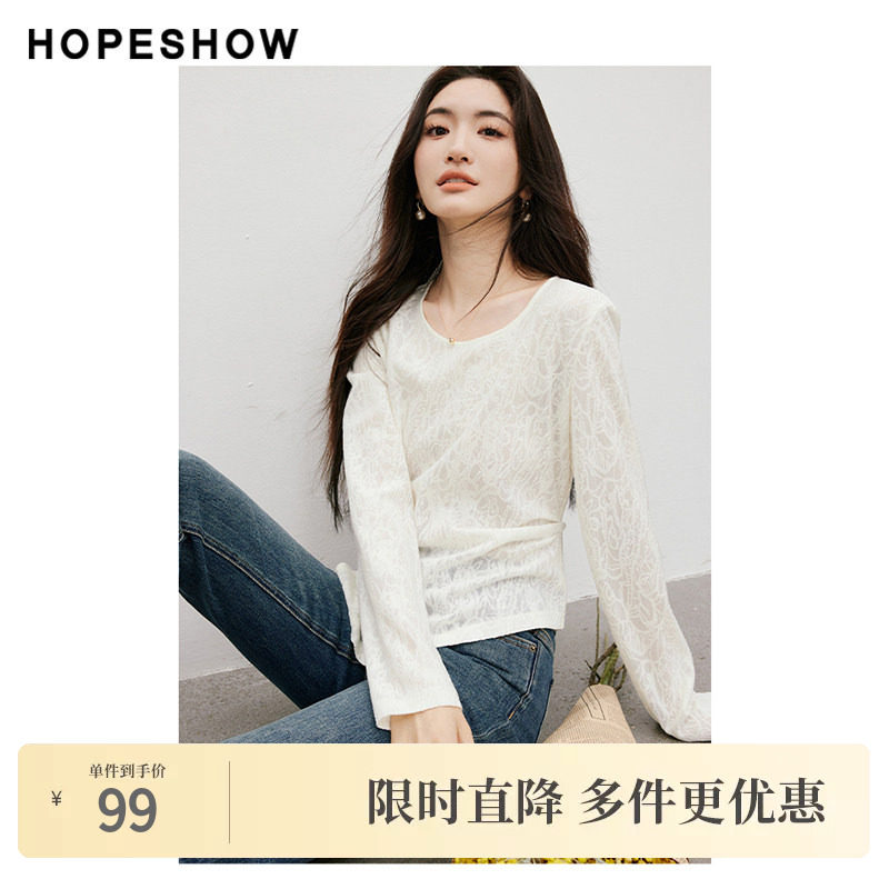 沫晗依美撞色提花肌理木耳边女T恤2025冬季新款气质显瘦打底衫女
