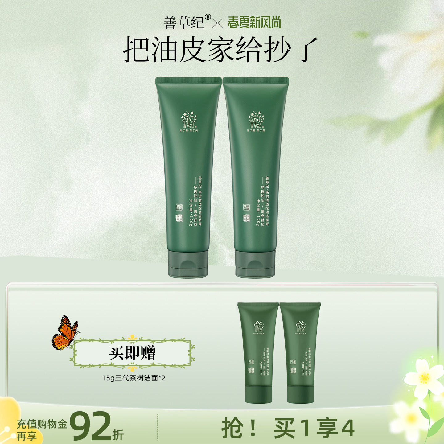 善草纪茶树三代洁面男女春夏油皮油痘肌深层清洁控油收敛洗面奶