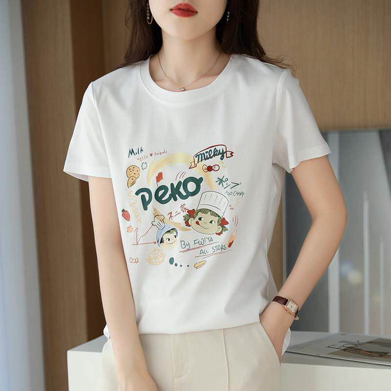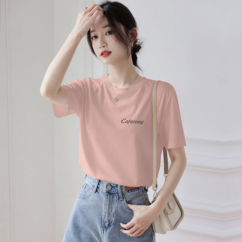 丝光纯棉T恤女士短袖夏季新款圆领半袖全棉正肩印花套头打底上衣
