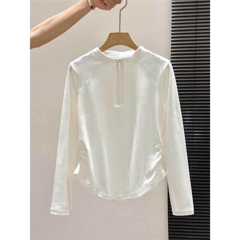欧货辣妹风ins收腰褶皱T恤女春秋装半拉链正肩内搭打底衫长袖上衣