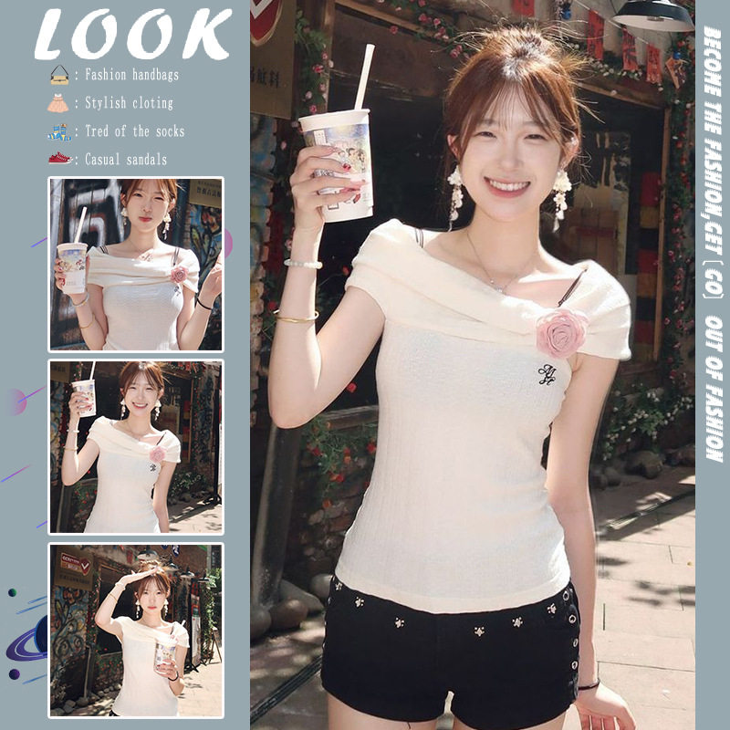 夏季法式气质温柔一字肩短袖t恤女纯欲辣妹超好看花朵露锁骨上衣