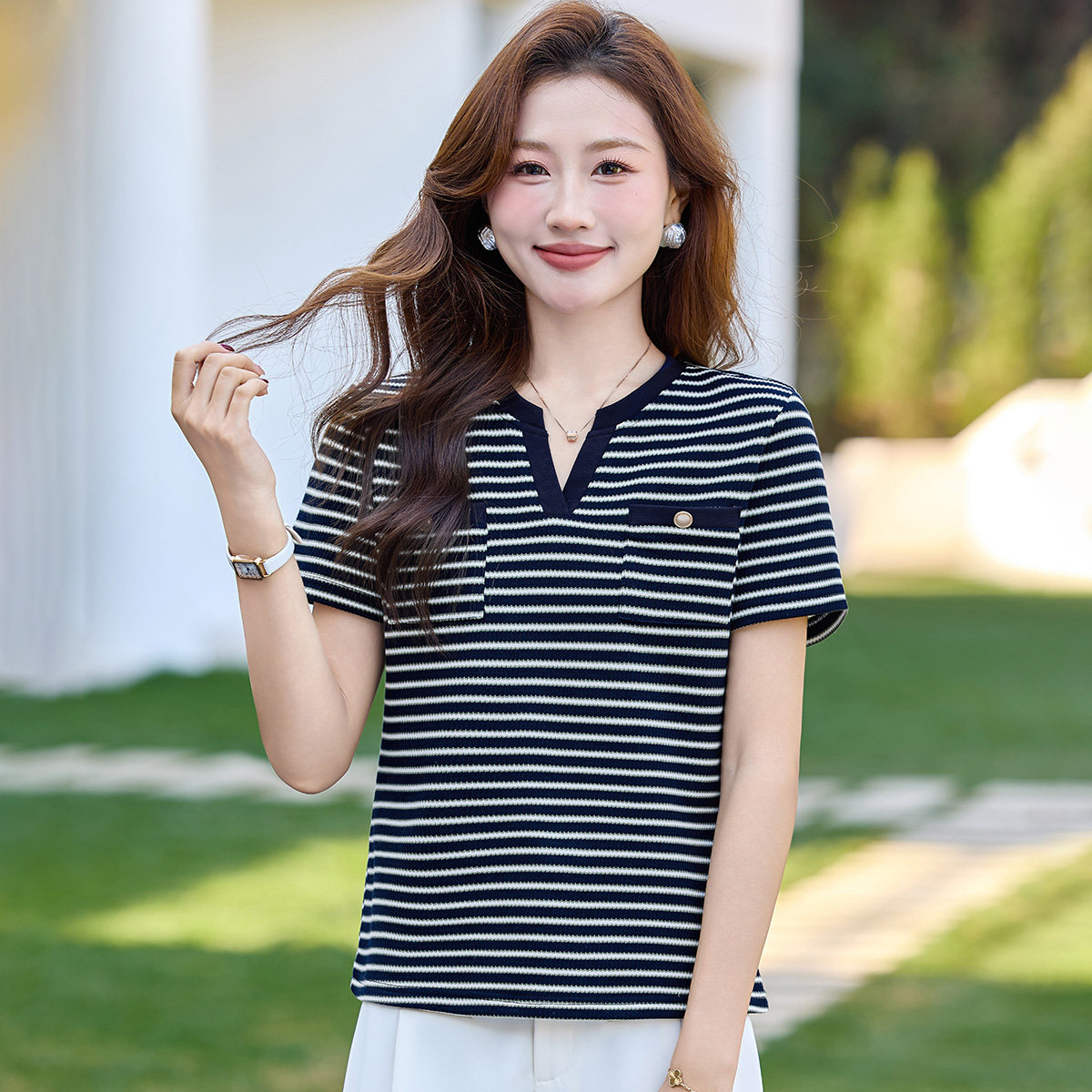 2026年夏季V领短袖T恤撞色洋气条纹小衫休闲风百搭减龄女士上衣