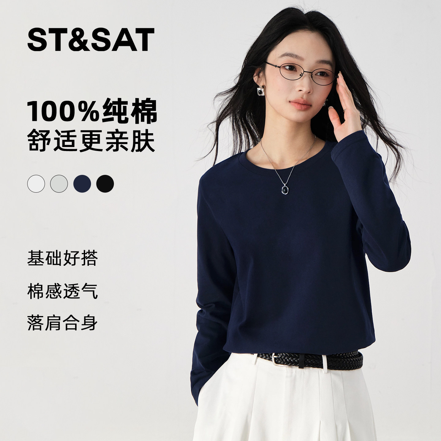 星期六藏青色长袖t恤女2026新款早春上衣女款重磅纯棉内搭打底衫Z