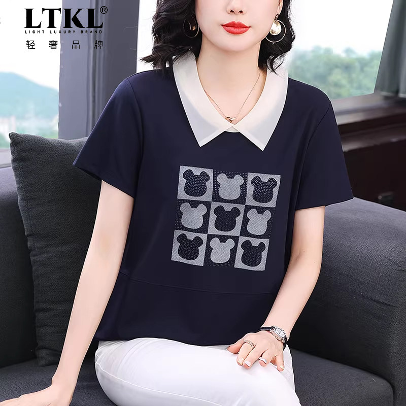 有领短袖t恤女夏2026年新款宽松遮肚中年妈妈拼接娃娃领半袖上衣