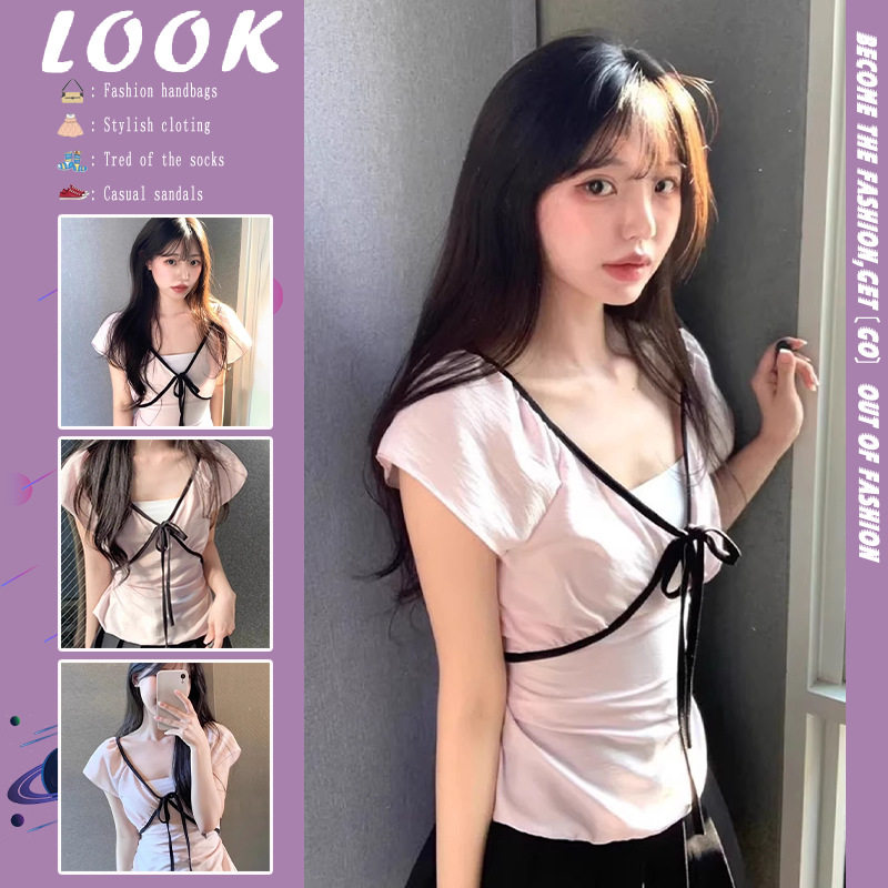 韩系绑带蝴蝶结v领甜美收腰短袖上衣撞色纯欲风修身系带泡泡袖T恤