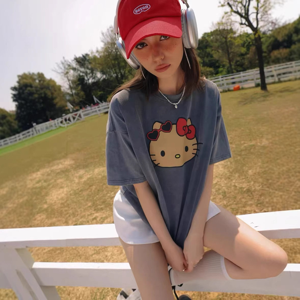 KT卡通印花T恤女短袖古着风可爱圆领上衣