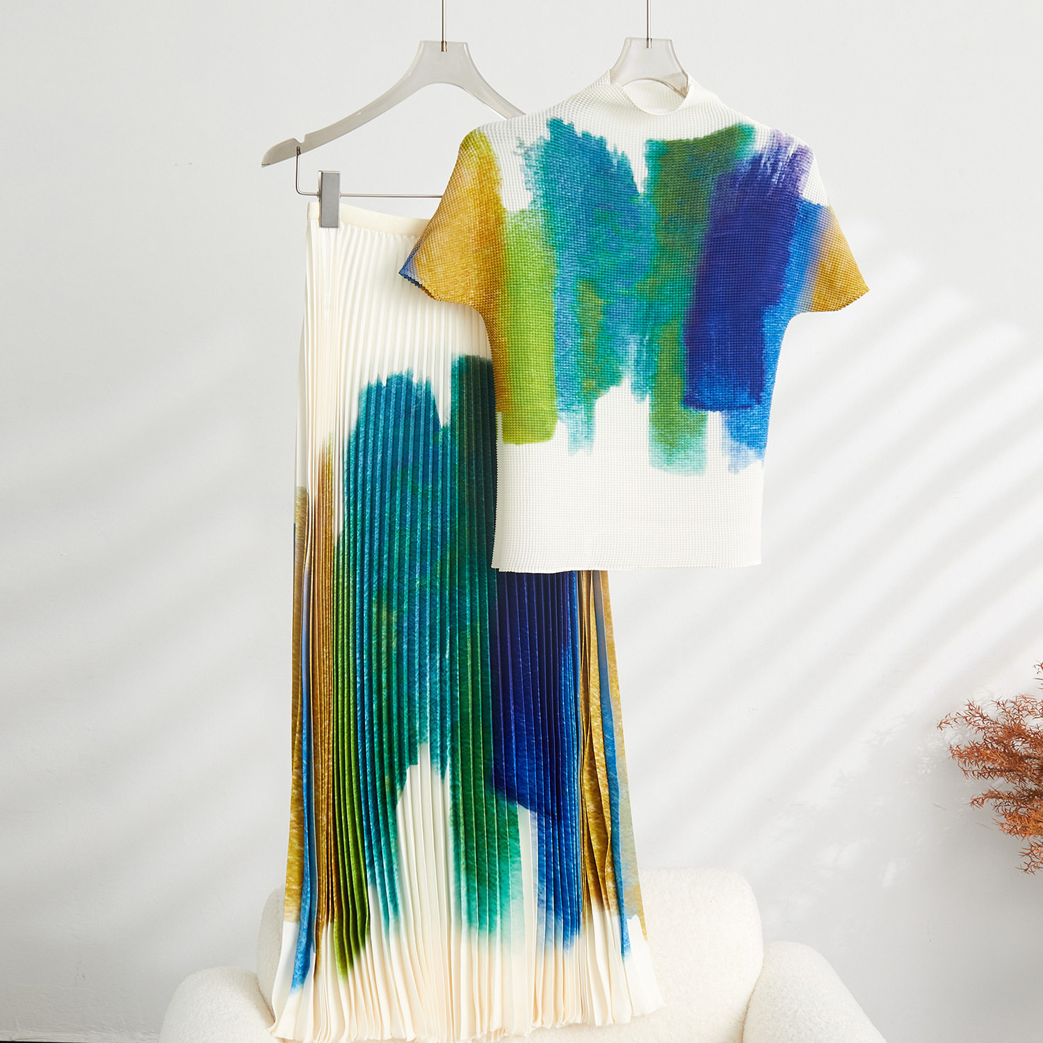 高端褶皱上衣女夏季新款薄款涂鸦印花T恤衫短袖ins潮半身长裙套装