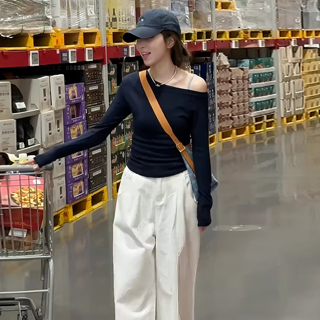 大码黑色露肩长袖t恤早秋女装2026新款胖mm显瘦内搭打底斜肩上衣