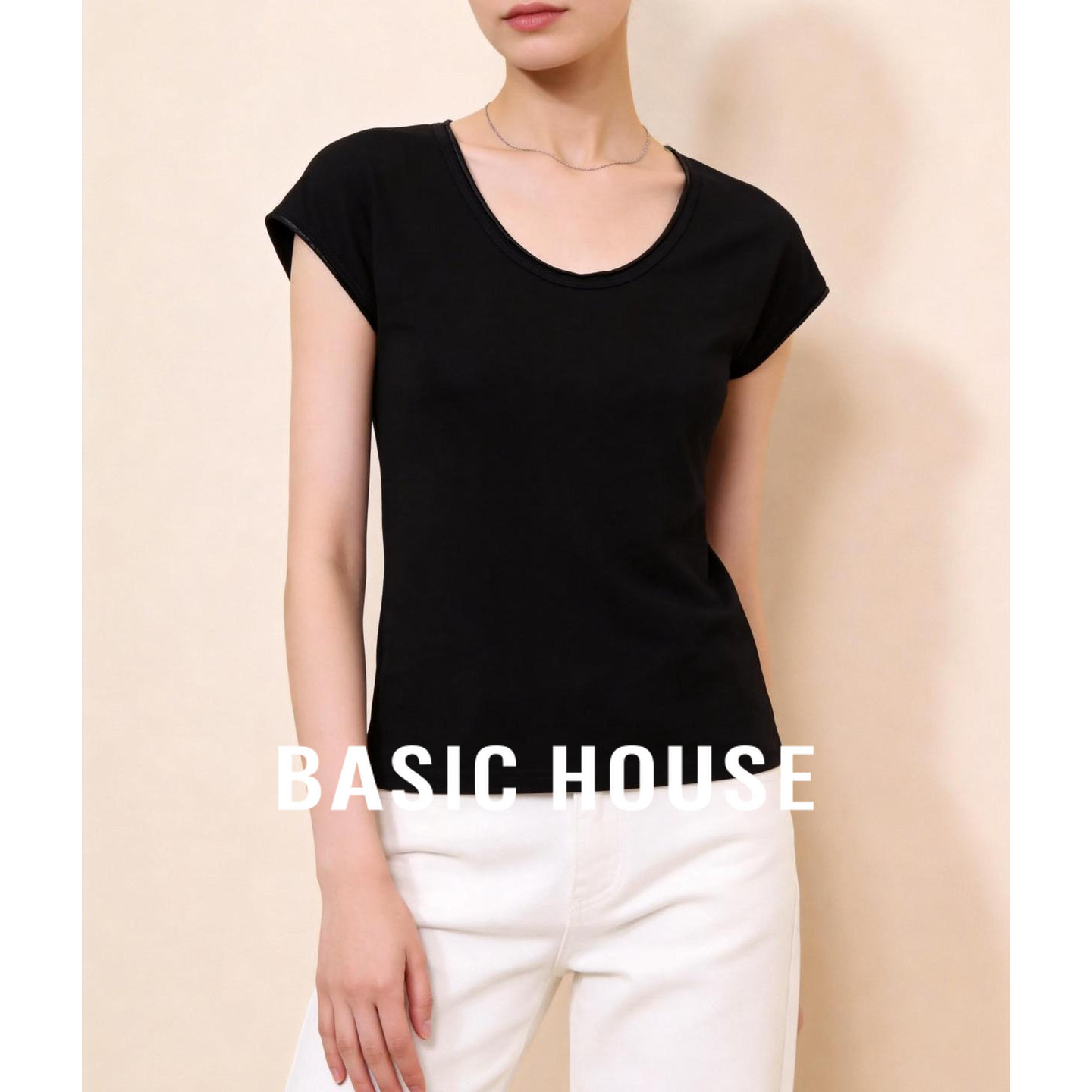 Basic House/百家好简约黑色U领短袖T恤女夏季基础款显瘦百搭上衣