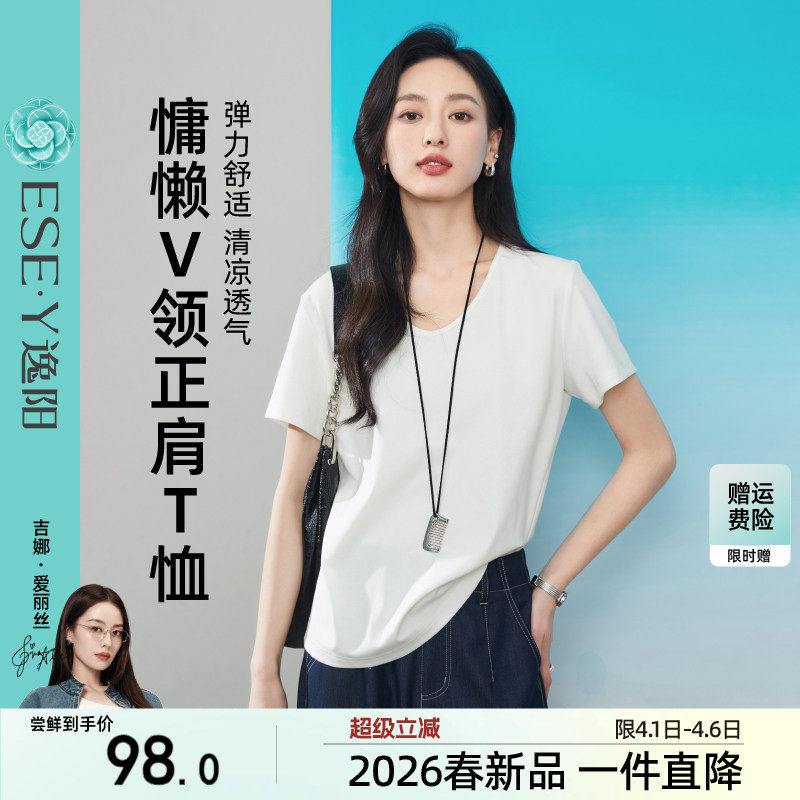 逸阳正肩短袖白T恤女2026年夏季新款V领宽松显瘦内搭纯色慵懒上衣