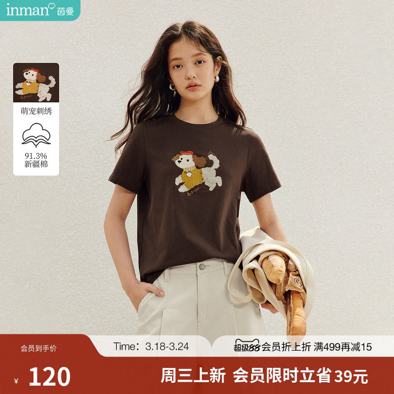 茵曼休闲趣味萌宠刺绣短袖T恤2026夏季女装新款钉珠正肩合体上衣