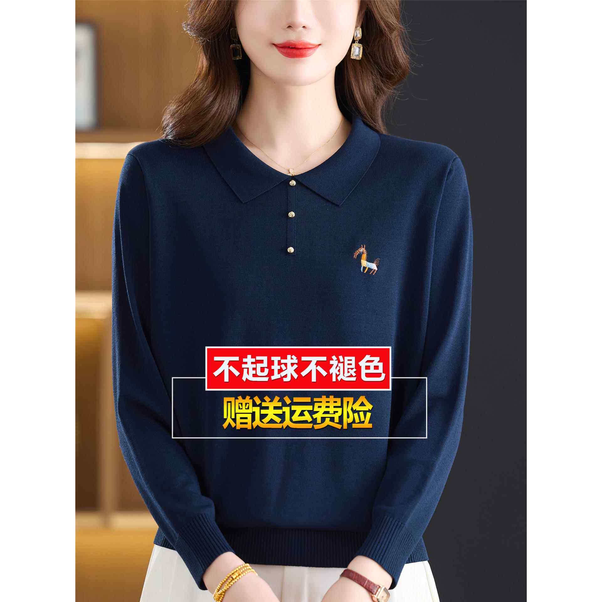 妈妈早秋季桑蚕丝长袖t恤女polo领新款显瘦大码针织上衣洋气小衫
