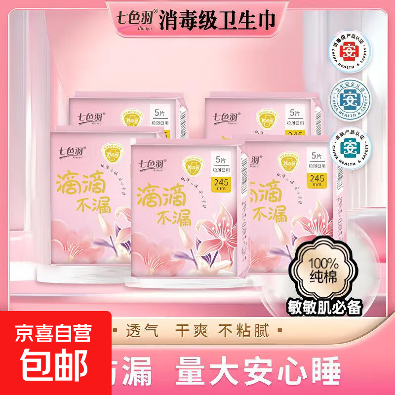 七色羽消毒级纯棉卫生巾日用245mm超薄透气亲肤姨妈巾学生防侧漏 纯棉 245mm 5片