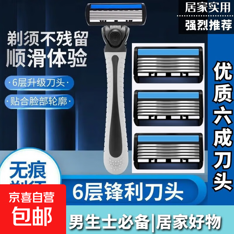 【京东配送】吉利同款六层手动剃须刀头替换头架刮胡刀男剃胡子刀片刮毛 1手柄+3刀片*升级款6层*