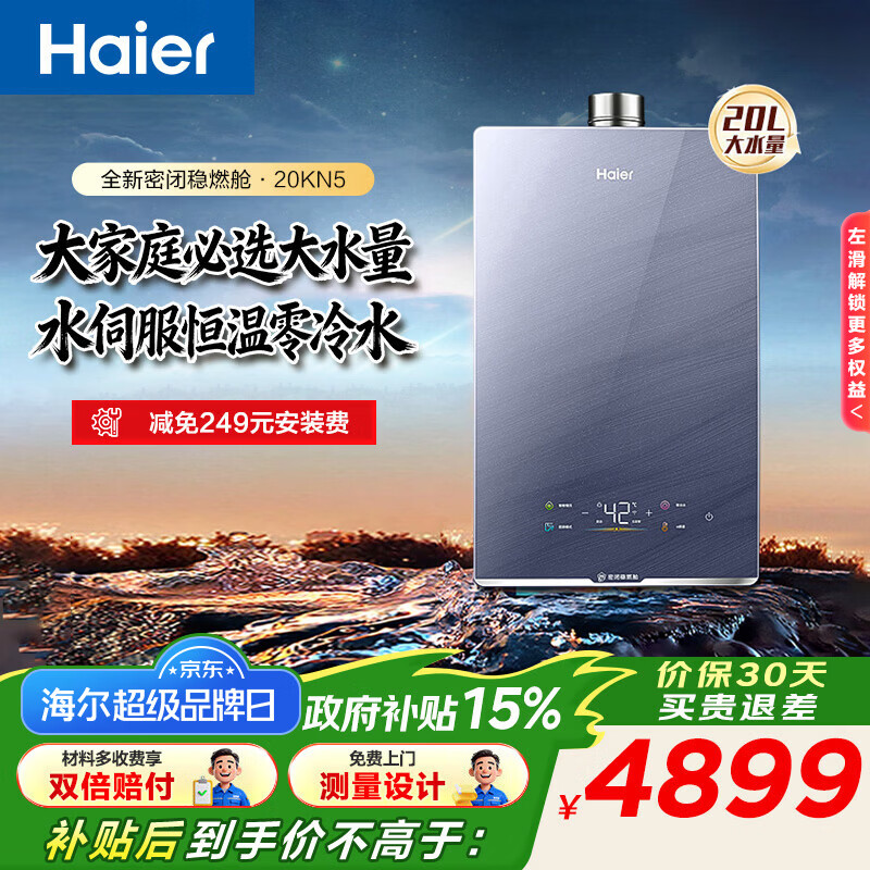 海尔(Haier)燃气热水器天然气家用强排式20升TSI增压无级变频水伺服三管零冷水静音大水量20KN5 20L 上市20升大数量KN5
