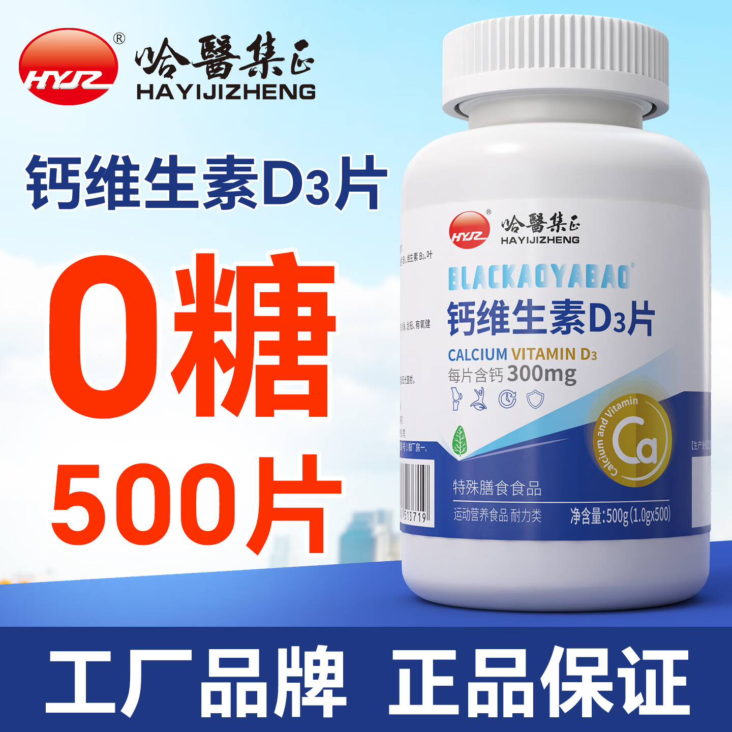 哈醫集正 0糖500片钙片维生素d3中老年人正品无糖碳酸钙VD3高钙成年人男女 0糖高含量碳酸钙维生素D3片 500片*1瓶