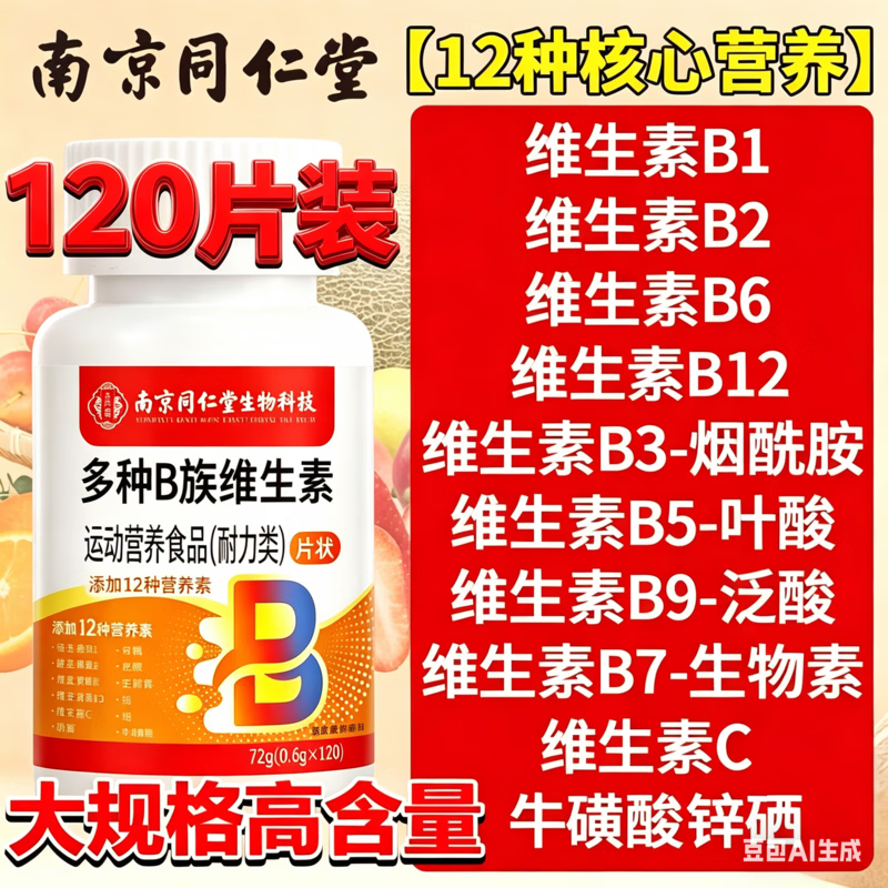 同仁堂(TRT)B族维生素多种复合维生素烟酰胺锌硒b b1 b2 b6 b12 B族维生素膳食片 120粒*1瓶