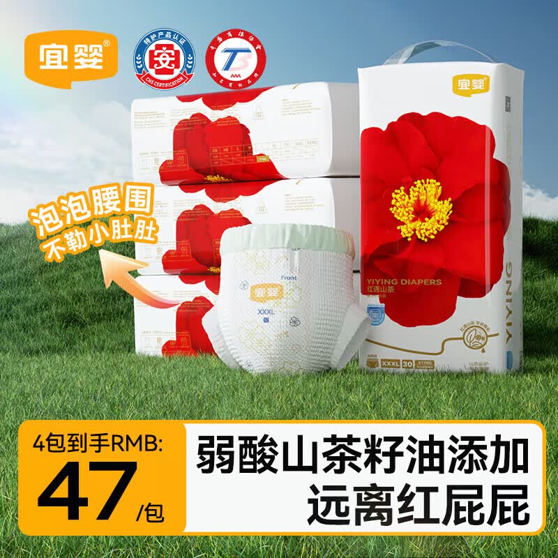 宜婴弱酸红山茶花干爽拉拉裤尿裤宝宝柔软尿裤润肤超薄透气尿不湿 拉拉裤XXXL号30片*4【17kg以上】