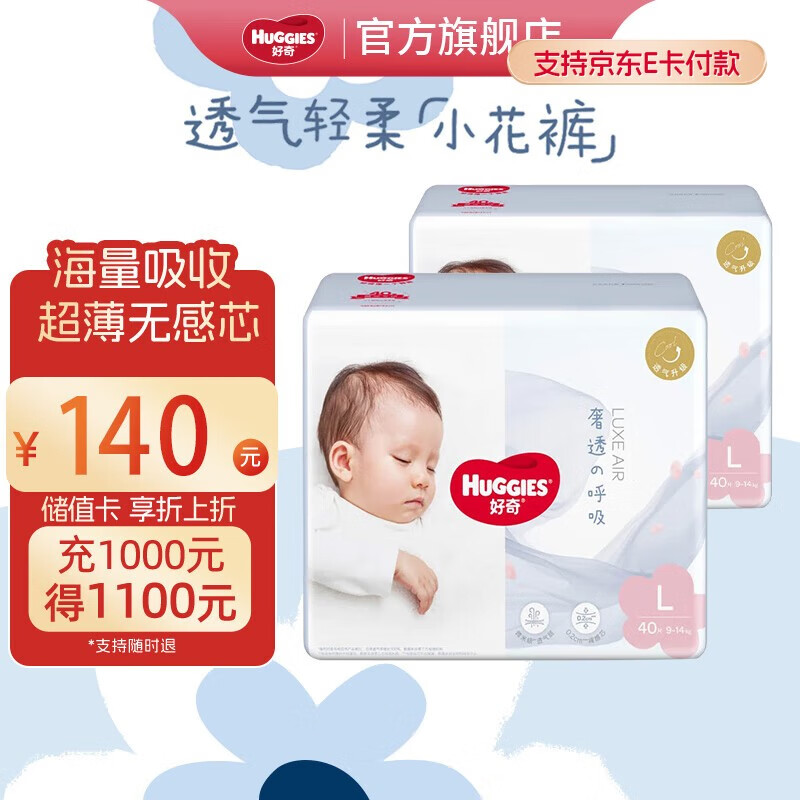好奇(Huggies)奢透呼吸纸尿裤 婴儿尿不湿尿裤宝宝干爽超薄透气柔 L 2包 80片 纸尿裤【9-14kg】
