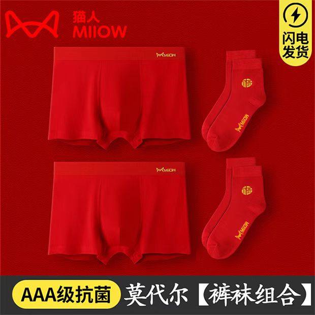 猫人红色男士内裤莫代尔裆抗菌本命年四角裤袜平角短裤头男结婚