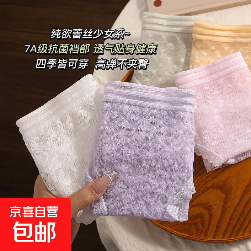 裸感超薄裸感网纱内裤女7A抑菌棉质底裆蕾丝中腰少女三角裤轻薄 1条装-浅紫 XL (120-140斤)