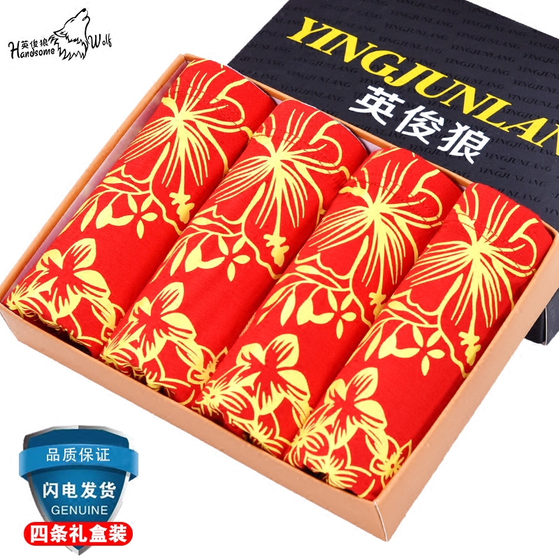 本命年男士内裤男生中腰透气平角裤纯棉大红色结婚礼物属龙四角短