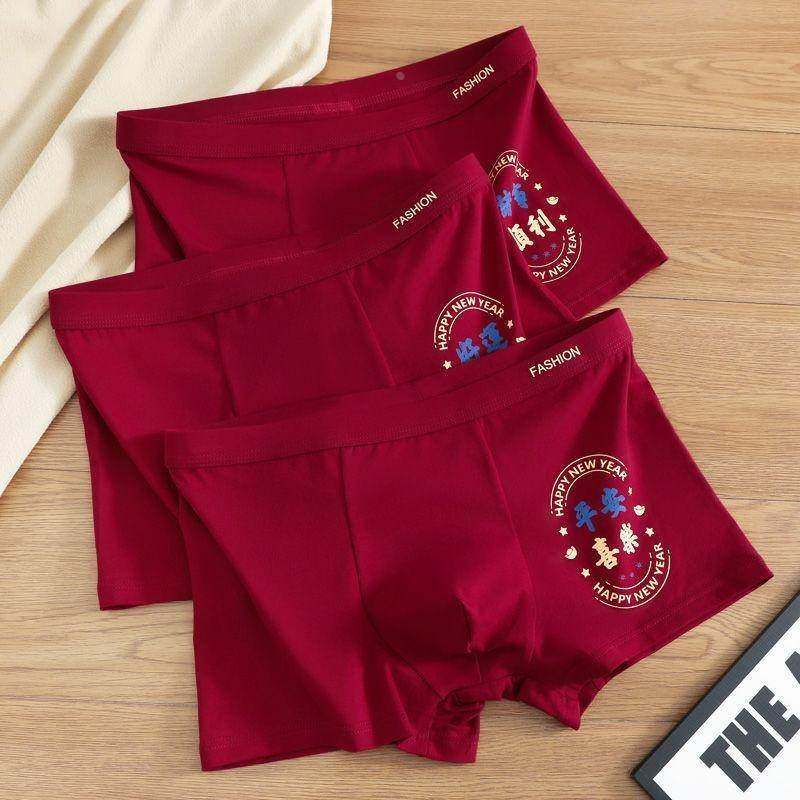 男士内裤纯棉舒适透气结婚新年红色印花喜庆裤头平角男生四角裤衩
