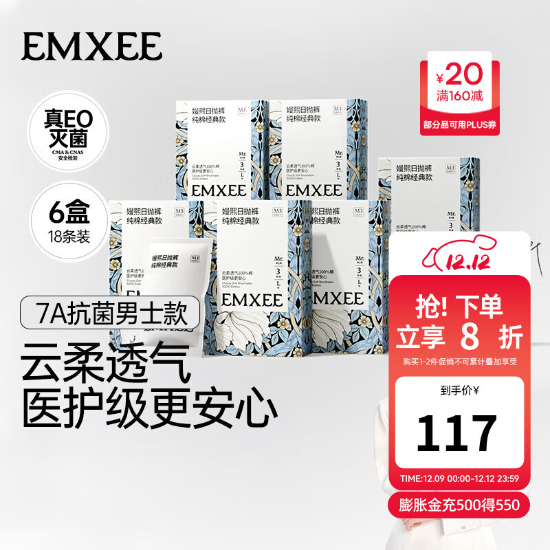 嫚熙(EMXEE)E3一次性内裤平角全棉纯棉短裤四角旅行成人免洗男士内裤大码 7A抗菌100%纯棉【男士款 18条】 XXL 建议150-170斤