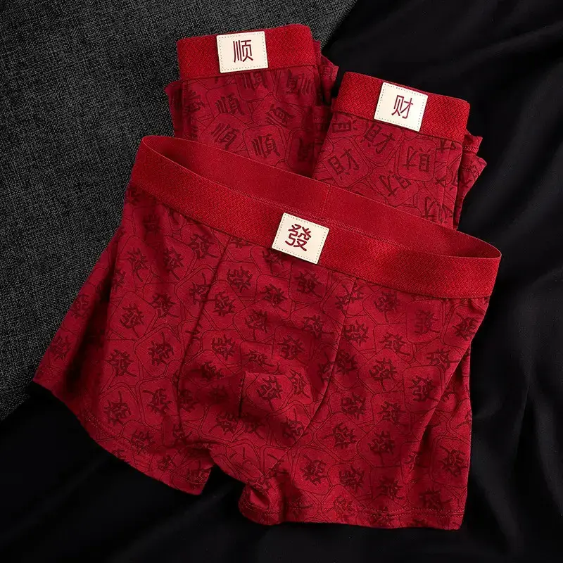 钞尤乾2026吉言印花保暖裤红内裤棉质酒红色男士内裤短裤纯棉