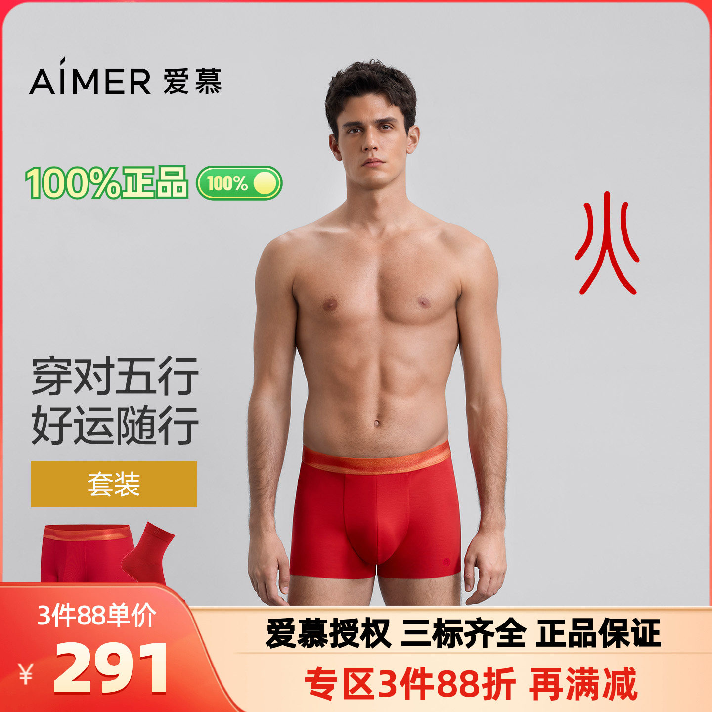 爱慕先生正品男士款红色本命年五行开运裤内裤+红色中筒袜子