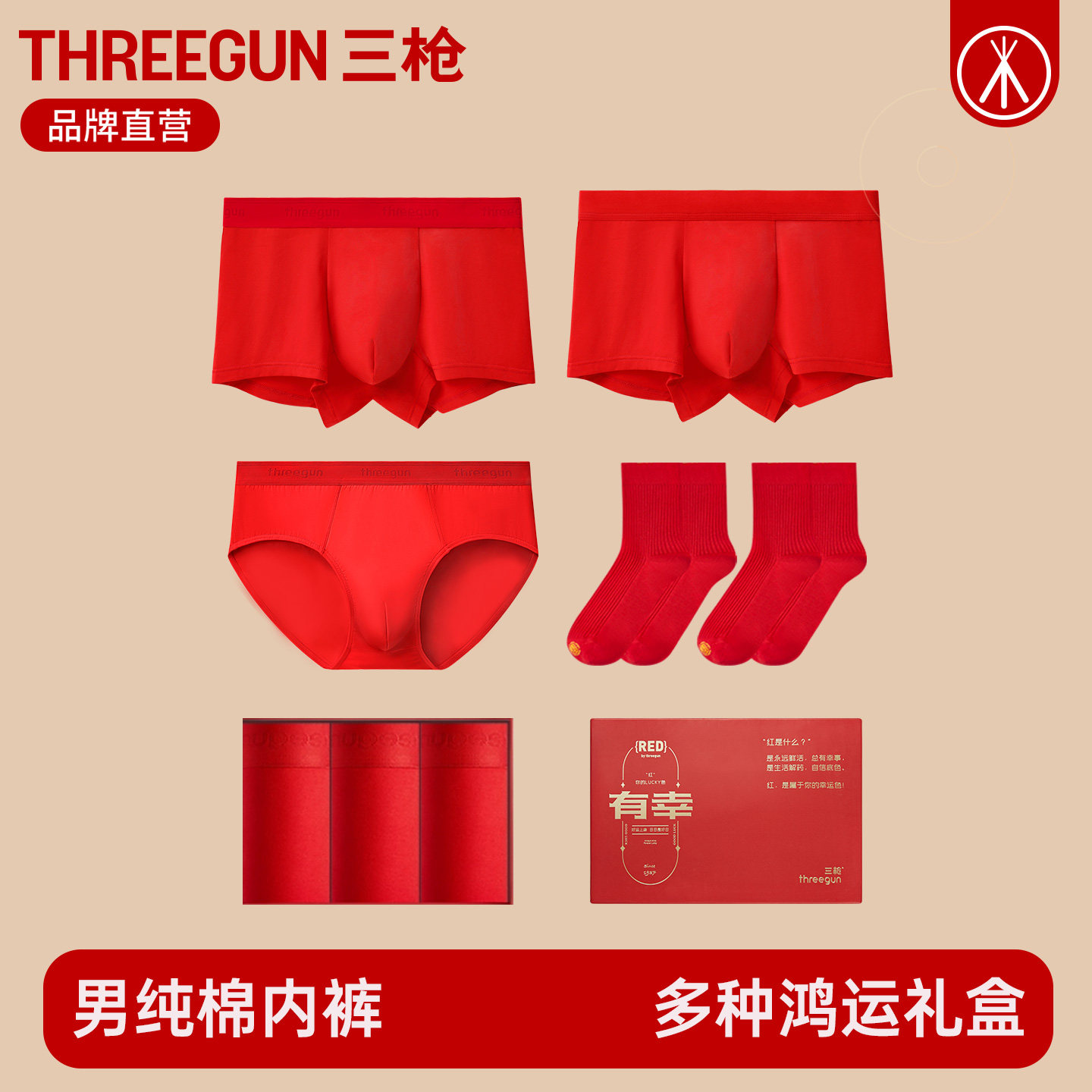 三枪内裤男纯棉马年本命年红色中腰男士平角裤袜子结婚礼盒三角裤