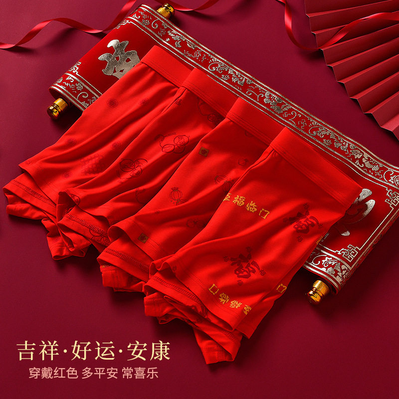 【下单立减50】新年红内裤过年棉质酒红色男士平角内裤喜庆居家wy
