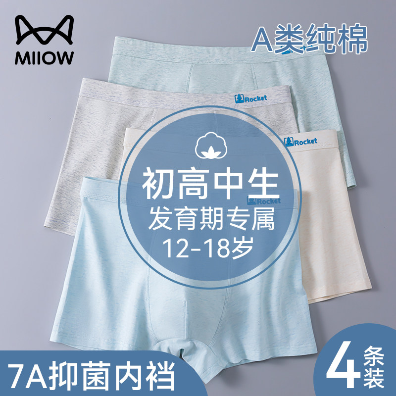 猫人青少年纯棉男士四角内裤发育期初高中男孩学生胖童四角短裤衩