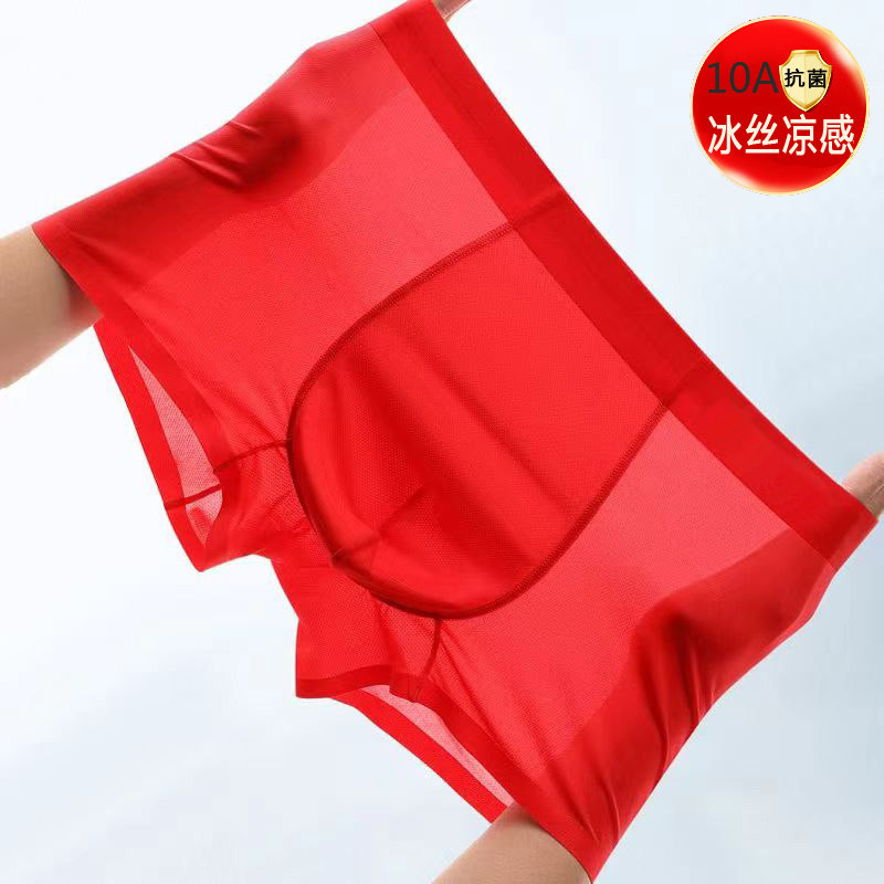 新款大红色冰丝短裤男士夏季薄透气抗菌内裤结婚礼物本命年平四角