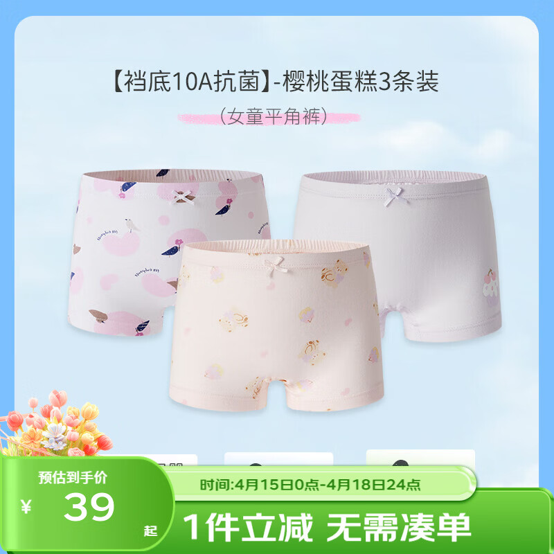 丽婴房儿童内裤纯棉内裤男女童内裤四角不夹PP中大童平角裤抗菌三条装 【100%棉】樱桃蛋糕-平角女童 【裆底10A抗菌】 3条 130 CM/8岁