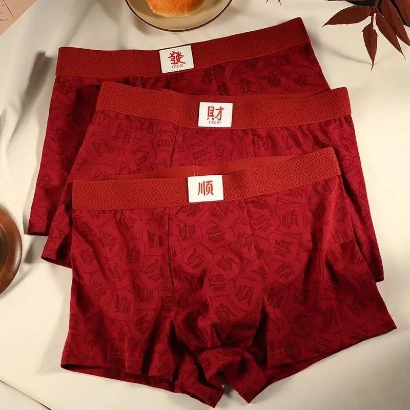 3条装!吉言提花酒红色内裤男生本命年马年舒适透气鸿运四角裤头
